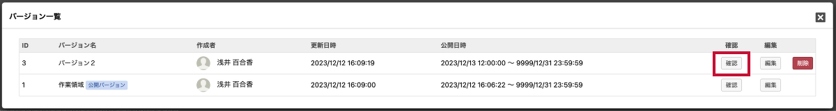 公開予約したいバージョンの「確認」を押します。