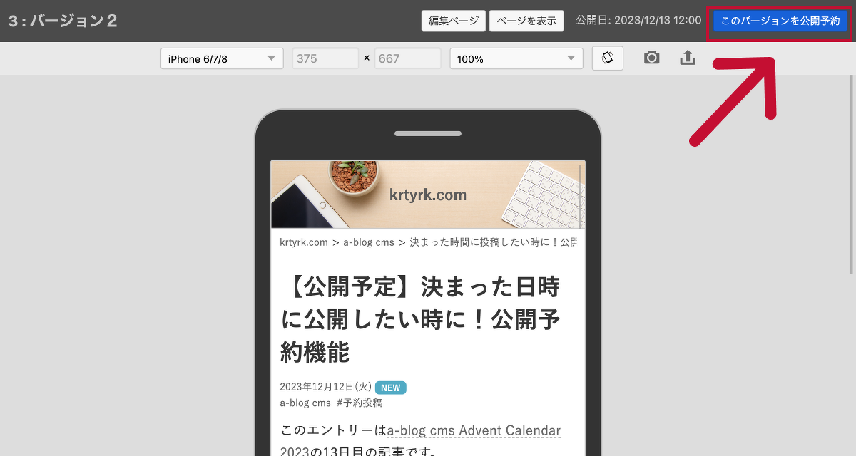 内容を確認したら、右上の「このバージョンを公開予約」を押します。これで公開予約の完了です。